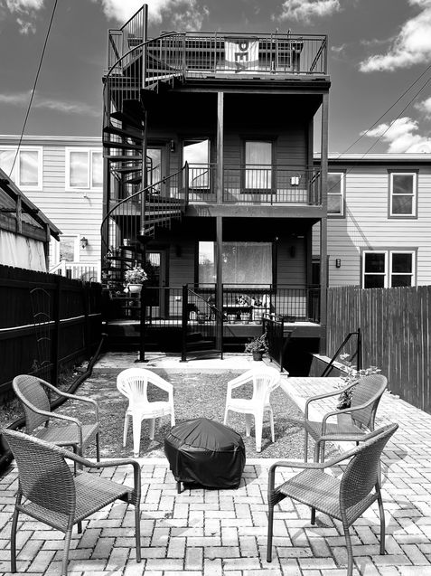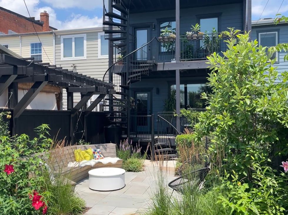 The main gathering space centers on a fire pit beneath the custom pergola, with built-in bench seating surrounded by layered plantings. A planted buffer separates the bluestone patio from the existing paving in the parking area, controlling costs while establishing distinct zones. An underutilized area beneath the spiral stair was repurposed to house a concealed rain barrel, capturing roof runoff for garden irrigation.